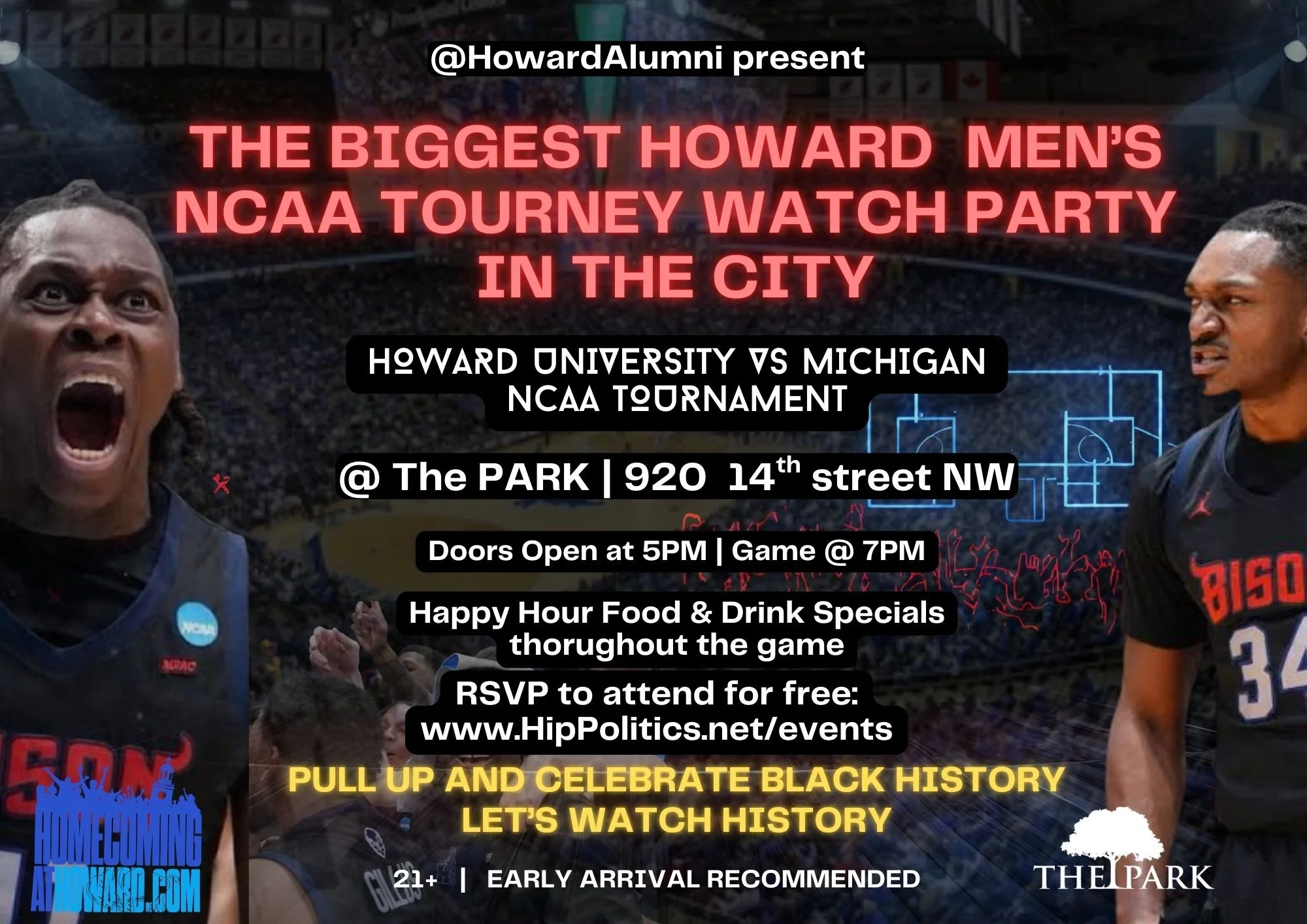 Join fellow Howard alumni, students, supporters, and friends at the legendary Park on 14th for an electric happy hour and watch party experience in the heart of Washington, D.C. Expect high energy, nonstop vibes, and a room full of Bison pride as we cheer on Howard and get ready to shock the world.